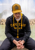Schwarz, schlicht, stylisch – die neue Capitals Hockey Weste überzeugt mit ihrem minimalistischen Design und hochwertigem Look. Der gelbe 3D-Druck mit der Aufschrift Capitals Hockey auf der Vorderseite sorgt für einen markanten, aber eleganten Akzent.